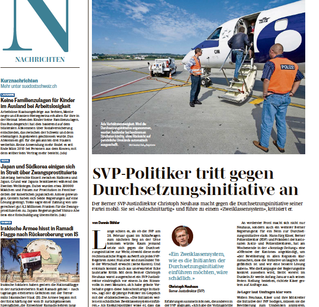 Lange schien es, als ob die SVP am 28. Februar quasi im Schlafwagen zum nächsten Sieg an der Urne kommen würde: Kaum jemand setzte sich gegen die Durchsetzungsinitiative zur Wehr, obwohl diese mehr rechtsstaatliche Fragen aufwirft als jedes SVP-Begehren zuvor. Nun aber sind zumindest Teile der Wirtschaft erwacht. Und erstmals kommt auch aus unerwarteter Ecke lautstarke Kritik: Mit dem Berner Christoph Neuhaus warnt ausgerechnet ein SVP-Justizdirektor eindringlich vor einem Ja des Stimmvolks in zwei Monaten. «Ich habe grösste Vorbehalte gegen diese holzschnittartige Initiative», sagt der 49-jährige Politiker im Gespräch mit der «Südostschweiz». «Die Initianten wollen ein schädliches Zweiklassensystem einführen.» Als Exekutivpolitiker wisse er, dass das Leben nie ausschliesslich schwarz oder weiss sei. Deshalb mache er sich für ein Strafrecht stark, das alle Menschen gleich hart bestrafe, unabhängig ihrer Staatsangehörigkeit.