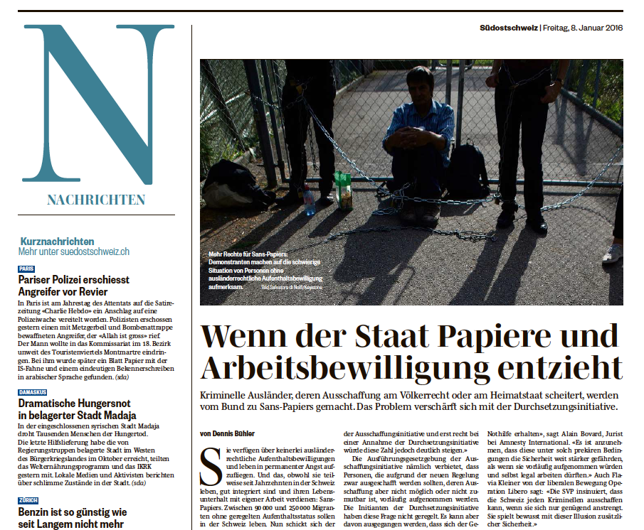 Sie verfügen über keinerlei ausländerrechtliche Aufenthaltsbewilligungen und leben in permanenter Angst aufzufliegen. Und das, obwohl sie teilweise seit Jahrzehnten in der Schweiz leben, gut integriert sind und ihren Lebensunterhalt mit eigener Arbeit verdienen: Sans-Papiers. Zwischen 90’000 und 250’000 Migranten ohne geregelten Aufenthaltsstatus sollen in der Schweiz leben. Nun schickt sich der Staat an, willentlich mehr Leute als bis anhin zu solch entrechteten Sans-Papiers zu machen. So nämlich sieht es das Gesetz zur Ausschaffungsinitiative vor und ist es bei einer Annahme der Durchsetzungsinitiative, über die am 28. Februar abgestimmt wird, absehbar.