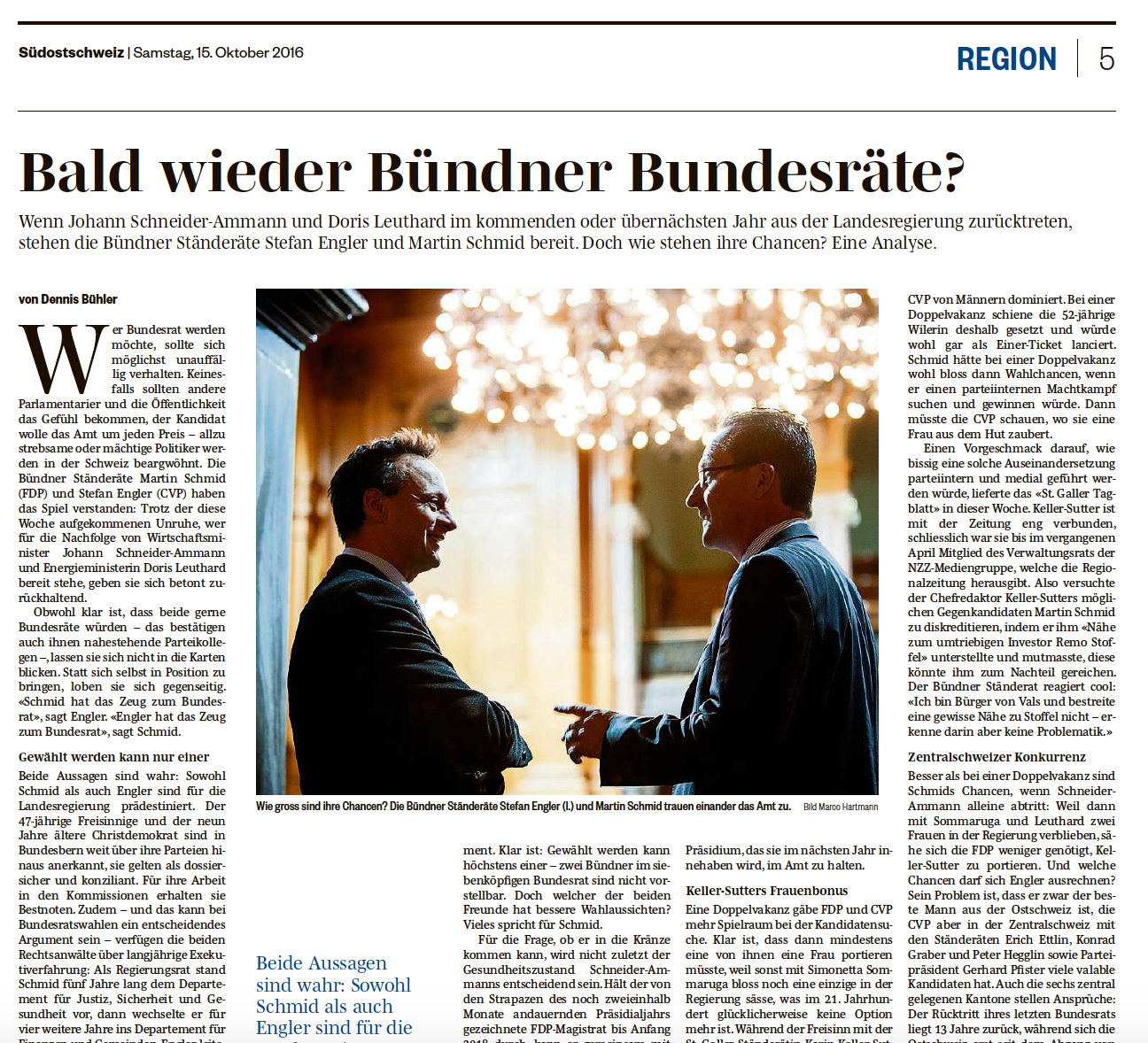 Wer Bundesrat werden möchte, sollte sich möglichst unauffällig verhalten. Keinesfalls sollten andere Parlamentarier und die Öffentlichkeit das Gefühl bekommen, der Kandidat wolle das Amt um jeden Preis – allzu strebsame oder mächtige Politiker werden in der Schweiz beargwöhnt. Die Bündner Ständeräte Martin Schmid (FDP) und Stefan Engler (CVP) haben das Spiel verstanden: Trotz der diese Woche aufgekommenen Unruhe, wer für die Nachfolge von Wirtschaftsminister Johann Schneider-Ammann und Energieministerin Doris Leuthard bereit stehe, geben sie sich betont zurückhaltend.