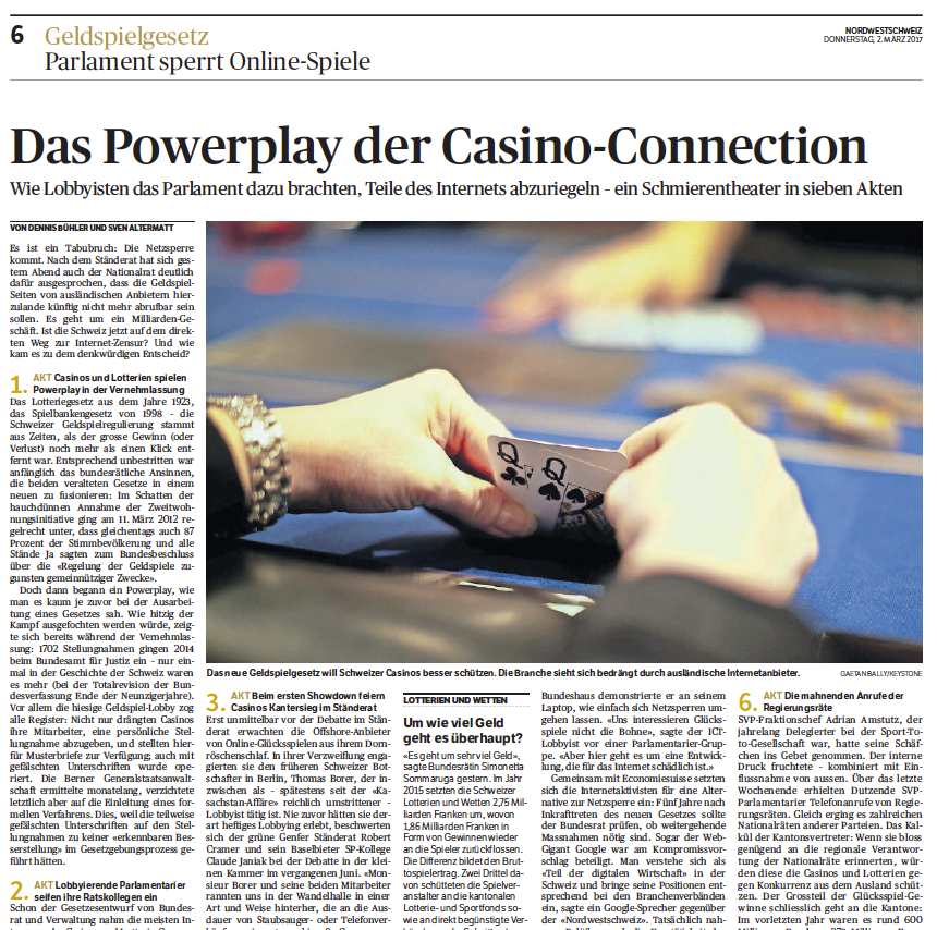 Schon der Gesetzesentwurf von Bundesrat und Verwaltung nahm die meisten Interessen der Casino- und Lotterie-Connection auf, die seit Jahren mit schwindenden Einnahmen kämpft und den Grund hierfür in der ausländischen Online-Konkurrenz sieht. Kein Wunder: Ihre Juristen hatten aktiv mitgeschrieben. Im Vorfeld der parlamentarischen Debatte intensivierten sie ihr Lobbying nochmals massiv. Der ehemalige CVP-Präsident Christophe Darbellay, Präsident des Schweizer Casino-Verbandes, und der Urner FDP-Ständerat Josef Dittli, Verwaltungsratspräsident von Swisslos, liessen ihre guten Beziehungen spielen.