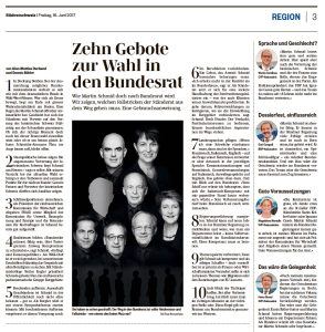 2.) Staatspolitische Grösse zeigen. Die angemessene Vertretung der lateinischen Schweiz liegt Schmid am Herzen – sagt er selbst (siehe Interview / PDF). Mit seinem Verzicht bei der aktuellen Wahl erbringt er den Tatbeweis und sammelt Punkte für die nächste Runde: Gerade Frauen und Vertreter der lateinischen Schweiz dürften sich dankbar zeigen.
