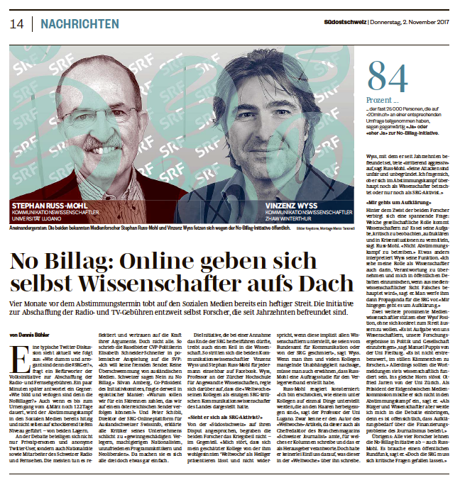 Die Initiative, die bei einer Annahme das Ende der SRG herbeiführen dürfte, treibt auch einen Keil in die Wissenschaft. So stritten sich die beiden Kommunikationswissenschaftler Vinzenz Wyss und Stephan Russ-Mohl für jedermann einsehbar auf Facebook. Wyss, Professor an der Zürcher Hochschule für Angewandte Wissenschaften, regte sich darüber auf, dass die «Weltwoche» seinen Kollegen als einzigen SRG-kritischen Kommunikationswissenschafter des Landes dargestellt hatte.