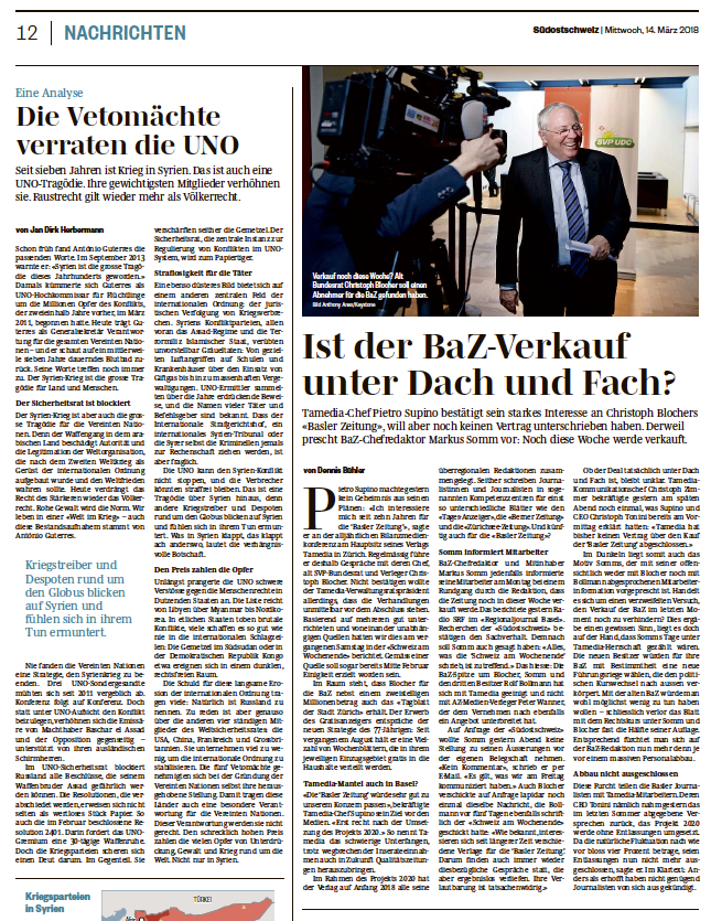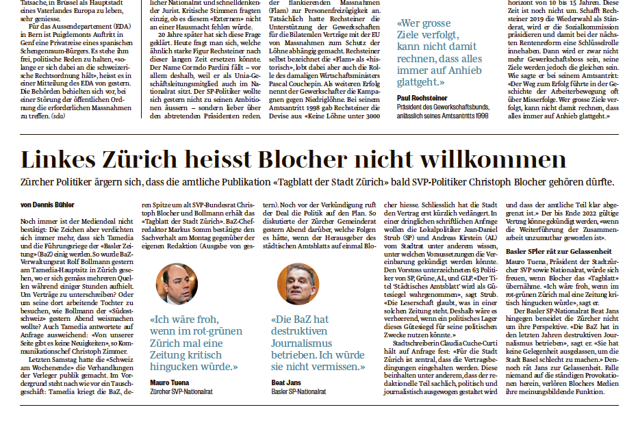 Letzten Samstag hatte die «Schweiz am Wochenende» die Verhandlungen der Verleger publik gemacht. Im Vordergrund steht nach wie vor ein Tauschgeschäft: Tamedia kriegt die BaZ, deren Spitze um alt SVP-Bundesrat Christoph Blocher und Bollmann erhält das «Tagblatt der Stadt Zürich». BaZ-Chefredaktor Markus Somm bestätigte den Sachverhalt am Montag gegenüber der eigenen Redaktion (Ausgabe von gestern).