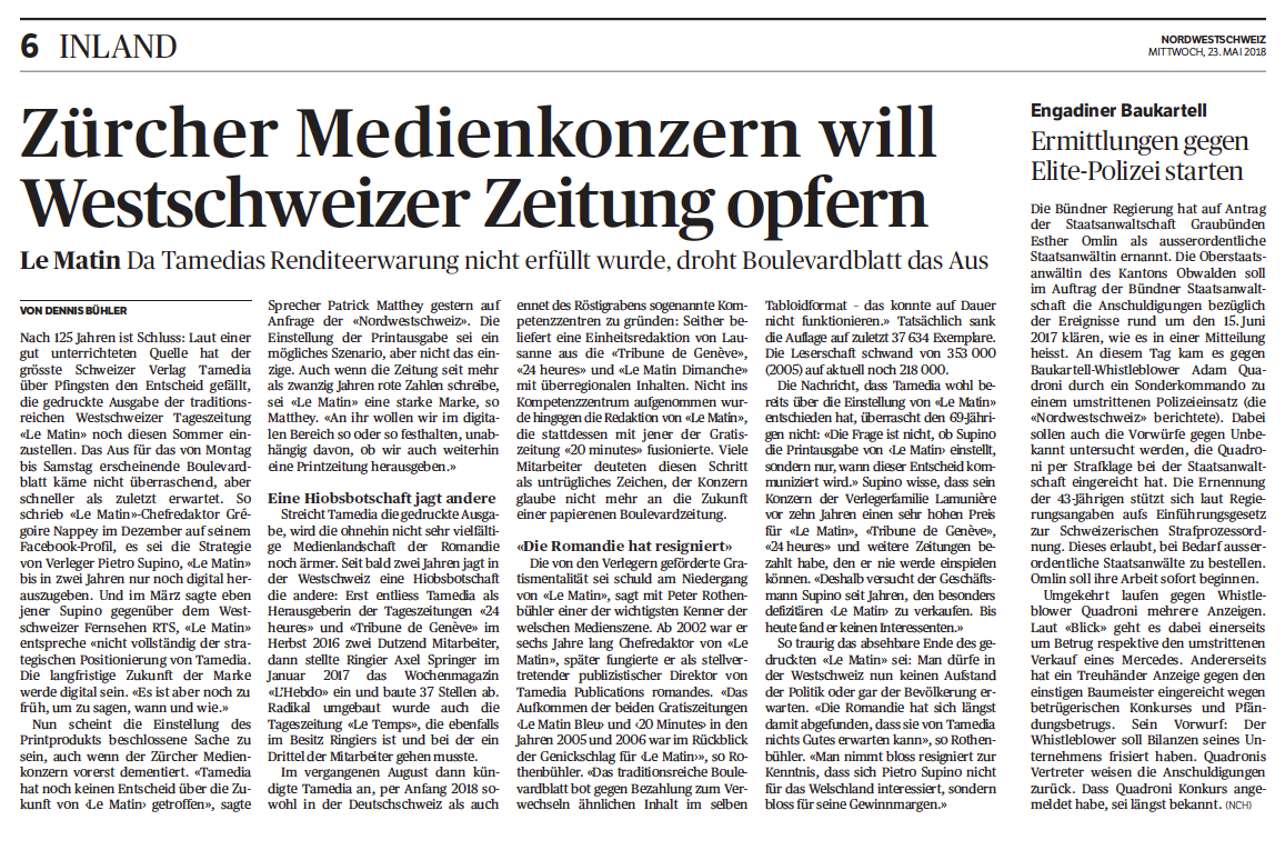 Nach 125 Jahren ist Schluss: Laut einer gut unterrichteten Quelle hat der grösste Schweizer Verlag Tamedia über Pfingsten den Entscheid gefällt, die gedruckte Ausgabe der traditionsreichen Westschweizer Tageszeitung «Le Matin» noch diesen Sommer einzustellen. Das Aus für das von Montag bis Samstag erscheinende Boulevardblatt käme nicht überraschend, aber schneller als zuletzt erwartet. So schrieb «Le Matin»-Chefredaktor Grégoire Nappey im Dezember auf seinem Facebook-Profil, es sei die Strategie von Verleger Pietro Supino, «Le Matin» bis in zwei Jahren nur noch digital herauszugeben. Und im März sagte eben jener Supino gegenüber dem Westschweizer Fernsehen RTS, «Le Matin» entspreche «nicht vollständig der strategischen Positionierung von Tamedia». Die langfristige Zukunft der Marke werde digital sein. «Es ist aber noch zu früh, um zu sagen, wann und wie.»