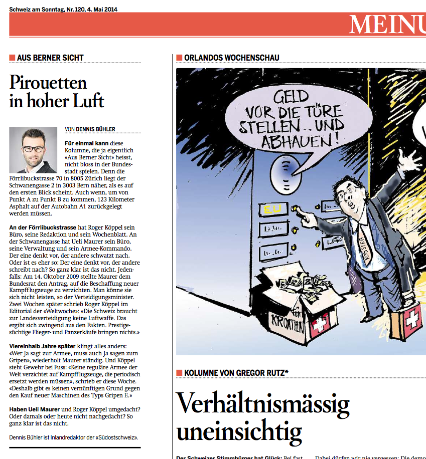 Viereinhalb Jahre später klingt alles anders: «Wer Ja sagt zur Armee, muss auch Ja sagen zum Gripen», wiederholt Maurer ständig. Und Köppel steht Gewehr bei Fuss: «Keine reguläre Armee der Welt verzichtet auf Kampfflugzeuge, die periodisch ersetzt werden müssen», schrieb er diese Woche. «Deshalb gibt es keinen vernünftigen Grund gegen den Kauf neuer Maschinen des Typs Gripen E.»