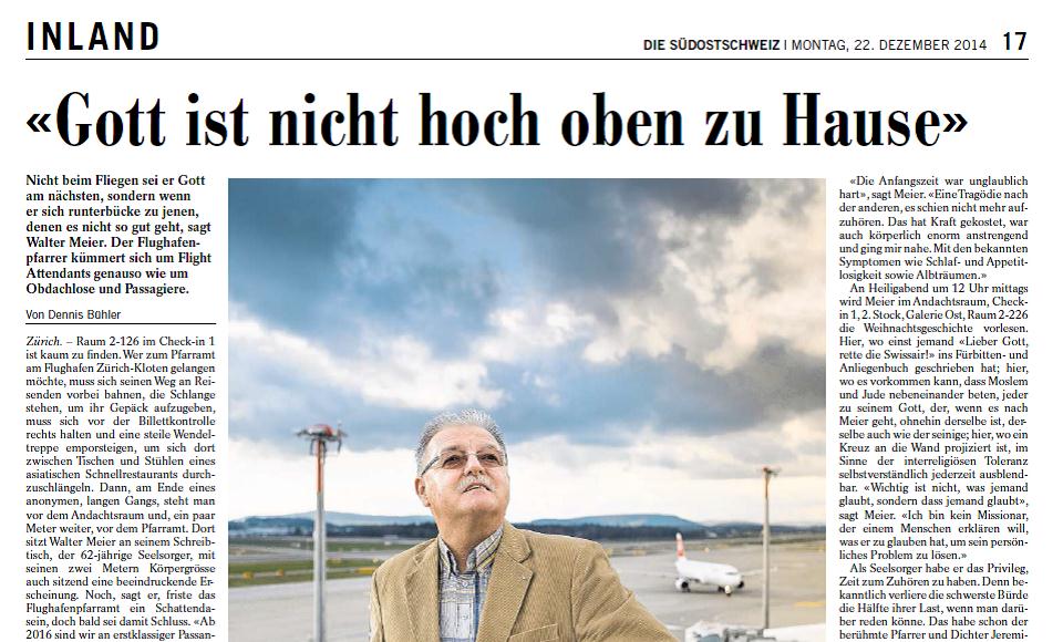 Raum 2-126 im Check-in 1 ist kaum zu finden. Wer zum Pfarramt am Flughafen Zürich-Kloten gelangen möchte, muss sich seinen Weg an Reisenden vorbei bahnen, die Schlange stehen, um ihr Gepäck aufzugeben, muss sich vor der Billettkontrolle rechts halten und eine steile Wendeltreppe emporsteigen, um sich dort zwischen Tischen und Stühlen eines asiatischen Schnellrestaurants durchzuschlängeln. Dann, am Ende eines anonymen, langen Gangs, steht man vor dem Andachtsraum und, ein paar Meter weiter, vor dem Pfarramt. Dort sitzt Walter Meier an seinem Schreibtisch, der 62-jährige Seelsorger, mit seinen zwei Metern Körpergrösse auch sitzend eine beeindruckende Erscheinung. Noch, sagt er, friste das Flughafenpfarramt ein Schattendasein, doch bald sei damit Schluss. «Ab 2016 sind wir an erstklassiger Passantenlage untergebracht, gleich neben dem Zugang zur Zuschauerterrasse.»