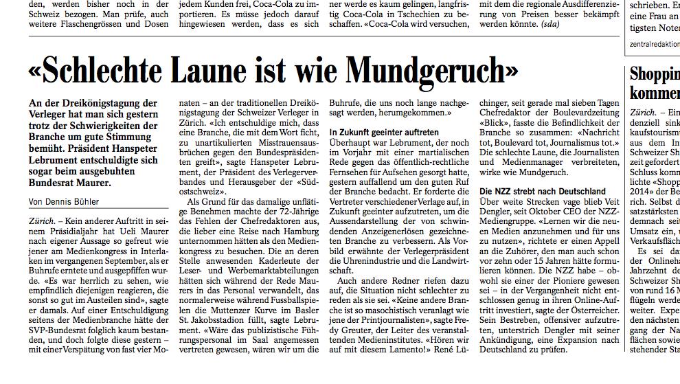 An der Dreikönigstagung am 7. Januar 2014 bemühen sich die Vertreter der Branche im Wandel trotz ungelösten Problemen und bekannten Schwierigkeiten um gute Stimmung. Sowohl Verlegerpräsident Hanspeter Lebrument als auch Blick-Chefredaktor René Lüchinger und Veit Dengler, der CEO der NZZ-Gruppe, versuchen Aufbruchsstimmung zu verströmen. Und Lebrument entschuldigt sich sogar beim im September 2013 ausgebuhten Bundespräsident Ueli Maurer.