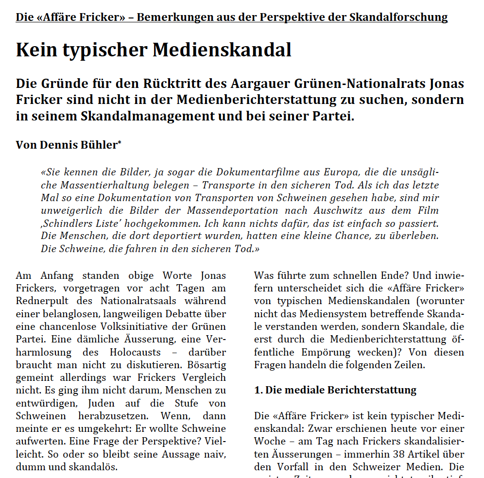 Was führte zum schnellen Ende? Und inwiefern unterscheidet sich die «Affäre Fricker» von typischen Medienskandalen (worunter nicht das Mediensystem betreffende Skandale verstanden werden, sondern Skandale, die erst durch die Medienberichterstattung öffentliche Empörung wecken)? Von diesen Fragen handeln die folgenden Zeilen.