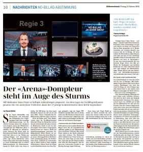 Doch der Reihe nach: Zwei Diskussionen über die No-Billag-Initiative übersteht Projer im November und im Januar unbeschadet, für seine souveräne Moderation erhält er Lob von beiden Lagern. Dann lädt er vergangenen Freitag erneut zur «Arena». Direkt vor Aufzeichnungsbeginn provoziert No-Billag-Initiant Olivier Kessler vor versammelter Gästeschar einen Eklat. Projer sei als «Zwangsgebühren-Profiteur» nicht unabhängig genug, um Bundesrätin Doris Leuthard zu interviewen, sagt er. Daher werde er diese Aufgabe übernehmen. «Dieser Knall hat Projer, nachvollziehbarerweise, aus dem Konzept gebracht», sagt der Zuger FDP-Ständerat Joachim Eder, der im Studio dabei war. Wie Kessler sei danach auch Projer rechthaberisch aufgetreten und allen Gästen noch häufiger ins Wort gefallen als bei früheren Sendungen.