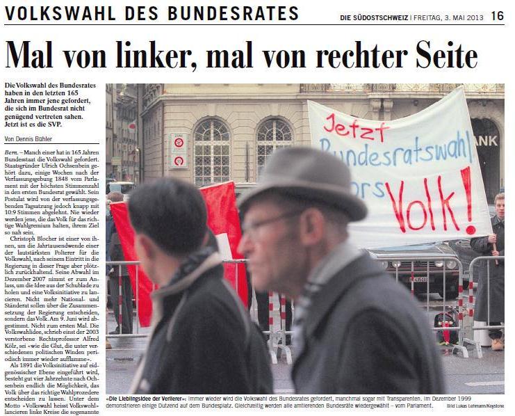 Manch einer hat in 165 Jahren Bundesstaat die Volkswahl gefordert. Staatsgründer Ulrich Ochsenbein gehört dazu, einige Wochen nach der Verfassungsgebung 1848 vom Parlament mit der höchsten Stimmenzahl in den ersten Bundesrat gewählt. Sein Postulat wird von der verfassungsgebenden Tagsatzung jedoch knapp mit 10:9 Stimmen abgelehnt. Nie wieder werden jene, die das Volk für das richtige Wahlgremium halten, ihrem Ziel so nah sein. Christoph Blocher ist einer von ihnen, um die Jahrtausendwende einer der lautstärksten Polterer für die Volkswahl, nach seinem Eintritt in die Regierung in dieser Frage aber plötzlich zurückhaltend. Seine Abwahl im Dezember 2007 nimmt er zum Anlass, um die Idee aus der Schublade zu holen und eine Volksinitiative zu lancieren. Nicht mehr National- und Ständerat sollen über die Zusammensetzung der Regierung entscheiden, sondern das Volk. Am 9. Juni wird abgestimmt. Nicht zum ersten Mal. Die Volkswahlidee, schrieb einst der 2003 verstorbene Rechtsprofessor Alfred Kölz, sei «wie die Glut, die unter verschiedenen politischen Winden periodisch immer wieder aufflamme».