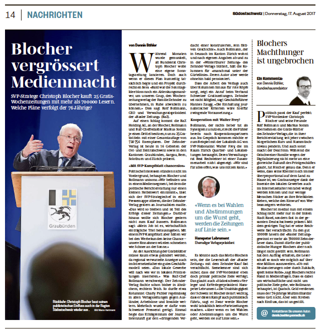 Politisch passt der Kauf perfekt: SVP-Vordenker Christoph Blocher und seine Freunde Rolf Bollmann und Markus Somm übernehmen die Gratis-Blätter des Zehnder-Verlags, die in ihrer Berichterstattung seit jeher zwischen bürgerlichem Kurs und Stammtischniveau pendeln. Und auch sonst macht der Deal Sinn: Während die Ostschweizer Familie wegen der Digitalisierung nicht mehr an eine glorreiche Zukunft des Printgeschäftes glaubt, tut Blocher genau das. Denn er weiss, dass seine Klientel noch immer überproportional auf dem Land zu Hause ist, wo Gratisanzeiger dank der Inserate des lokalen Gewerbes auch im Internetzeitalter rentabel verlegt werden können und nur wenige Menschen Sticker an ihre Briefkästen kleben, welche den Einwurf von Werbeanzeigern verbieten.