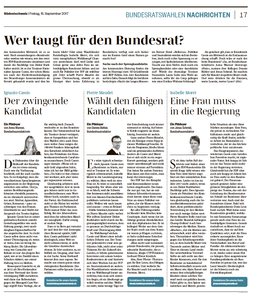 Ein Plädoyer für Bundesratskandidat Pierre Maudet, erschienen am 15. September 2017 in der Südostschweiz sowie der Aargauer Zeitung / Nordwestschweiz.