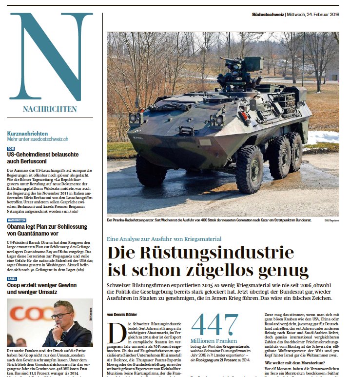Ein Kommentar zur Schweizer Doppelmoral, mit der aus Kriegen Profit geschlagen wird, erschienen am 5. Januar 2016 in der Südostschweiz. Plus ein dazugehöriger Hintergrundbericht zum Schweizer Handel mit dem gegenwärtig als Aggressor auftretenden Saudi-Arabien, erschienen gleichentags in der Südostschweiz sowie der Aargauer Zeitung / Nordwestschweiz.