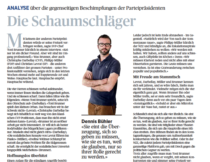 Die vier Herren schiessen verbal aufeinander, wenn immer ihnen Medien die Gelegenheit geben. Und sie schiessen scharf. Dann fallen Sätze wie die folgenden: «Wenn Toni Brunner spricht, setze ich den Ohrschutz auf» (Darbellay); «Toni Brunner spielt den kleinen Orban. Das brauchen wir in der Schweiz nicht» (Levrat); «Christophe Darbellay bewegt sich inhaltlich so weit weg von den klassischen CVP-Positionen, dass man ihn nicht ernst nehmen kann» (Levrat); «Brunner ist an seriöser Arbeit gar nicht interessiert. Er will sich als bester Bodybuilder des bürgerlichen Lagers profilieren – nur: Muskeln sind nicht gleich Hirn» (Darbellay); «Die sozialistischen Rezepte von Levrat führen ins Fiasko» (Müller); «Eveline Widmer-Schlumpf ist zurzeit das grösste Problem für die Eidgenossenschaft. Sie ermöglicht der sozialistischen Umverteilungspolitik Mehrheiten» (Brunner).