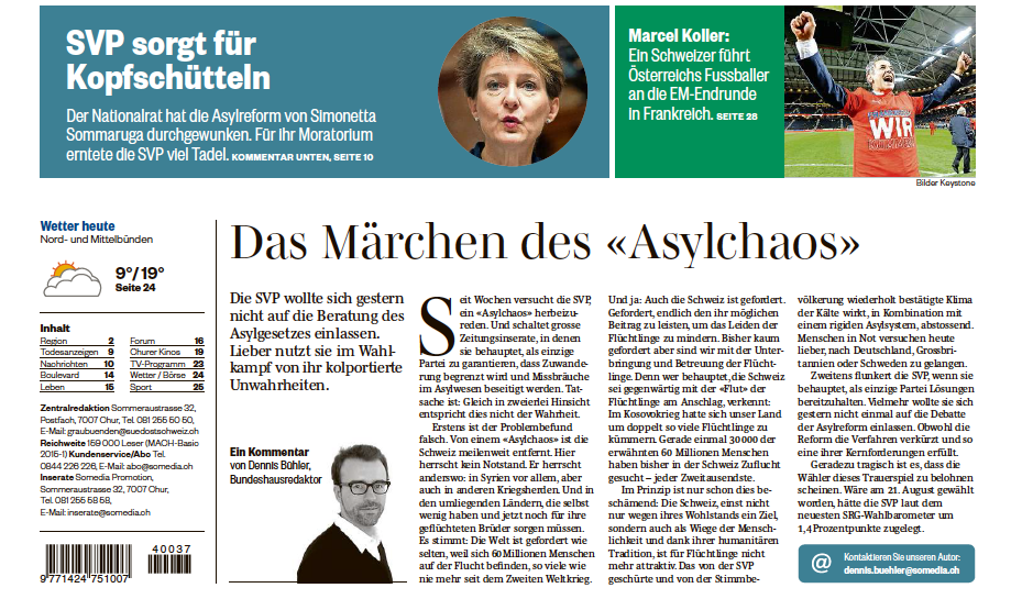 Die SVP wollte sich gestern nicht auf die Beratung des Asylgesetzes einlassen, obwohl mit ihm die Asylverfahren beschleunigt werden. Lieber nutzt sie im Wahlkampf von ihr kolportierte Unwahrheiten.Ein Kommentar, erschienen am 10. September 2015 in der Südostschweiz.
