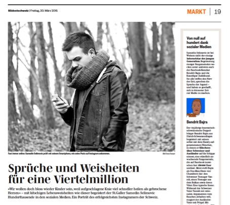«Wir wollen doch bloss wieder Kinder sein, weil aufgeschlagene Knie viel schneller heilen als gebrochene Herzen» – mit kitschigen Lebensweisheiten wie dieser begeistert der St. Galler Samedin Selimovic Hunderttausende in den sozialen Medien. Ein Porträt des erfolgreichsten Instagramers der Schweiz, erschienen am 20. März 2015 in der Südostschweiz und der Nordwestschweiz / Aargauer Zeitung sowie am 21. März 2015 auf Watson.