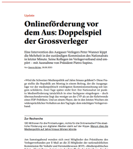 Aktiv werden Bühler und Nietlispach, nachdem sie am vergangenen Samstag in der «Schweiz am Wochenende» einen Meinungsbeitrag ihres Präsidiumskollegen Peter Wanner gelesen haben. Mit «Ungereimtheiten bei der digitalen Medienförderung» ist dessen ganzseitiger Artikel überschrieben. Rund 9000 Anschläge wendet der Aargauer Chef des Verlags CH Media auf, um die vom Bundesrat vorgeschlagene Onlineförderung in Bausch und Bogen zu verwerfen. Der Gesetzesvorschlag erweise sich bei näherem Hinsehen als Kuckucksei, schreibt Wanner, es türmten sich viele Fragezeichen und Ungereimtheiten auf. Und was bisher vom Verordnungsentwurf bekannt sei, sei noch schlimmer: Er wirke überhastet und nicht zu Ende gedacht. (…)