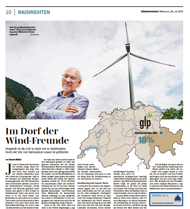 Dem Dorf an der Südostflanke des Calanda entgehen so Steuermillionen, wohlgelitten ist der 62-jährige Gasser trotzdem. Gegen sein Windrad mitten in der Rheintalebene gab es in Haldenstein kaum Opposition. Einzig ein paar Naturschützer warnten, Tausende Vögel könnten von der grössten Windenergieanlage der Schweiz zerstückelt werden. Doch eine Studie der Vogelwarte Sempach gab Gasser vor ein paar Wochen recht. Weder Vögel noch Fledermäuse lassen sich vom 119 Meter hohen und 317 Tonnen schweren Turm mit seinen 54,65 Meter langen Rotorblättern stören. 6,9 Millionen Franken liessen sich Gasser und sein Mitstreiter Jürg Michel die Windanlage vor zweieinhalb Jahren kosten. Im Jahresschnitt liefert sie 4,5 Millionen Kilowattstunden Strom. Gegenwärtig evaluieren die beiden Unternehmer mögliche Standorte für ein zweites Windrad.