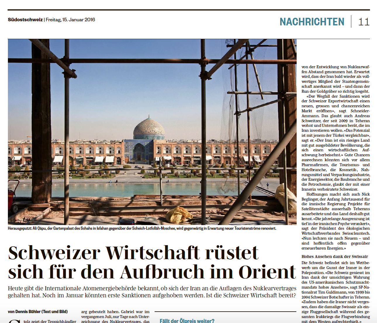 Ein Augenschein in Teheran und Isfahan und Gespräche mit Schweizer Iran-Experten, erschienen am 15. Januar 2016 in der Südostschweiz sowie der Aargauer Zeitung / Nordwestschweiz.