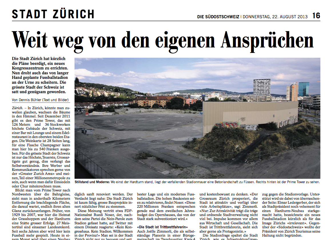 Die Stadt Zürich hat kürzlich die Pläne beerdigt, ein neues Kongresszentrum zu errichten. Nun droht auch das von langer Hand geplante Fussballstadion an der Urne zu scheitern. Die grösste Stadt der Schweiz ist satt und genügsam geworden.Ein Feature zur Lage der Stadt Zürich und ein Interview mit FCZ-Präsident Ancillo Canepa, erschienen am 22. August 2013 in der Südostschweiz und der Nordostschweiz / Aargauer Zeitung.