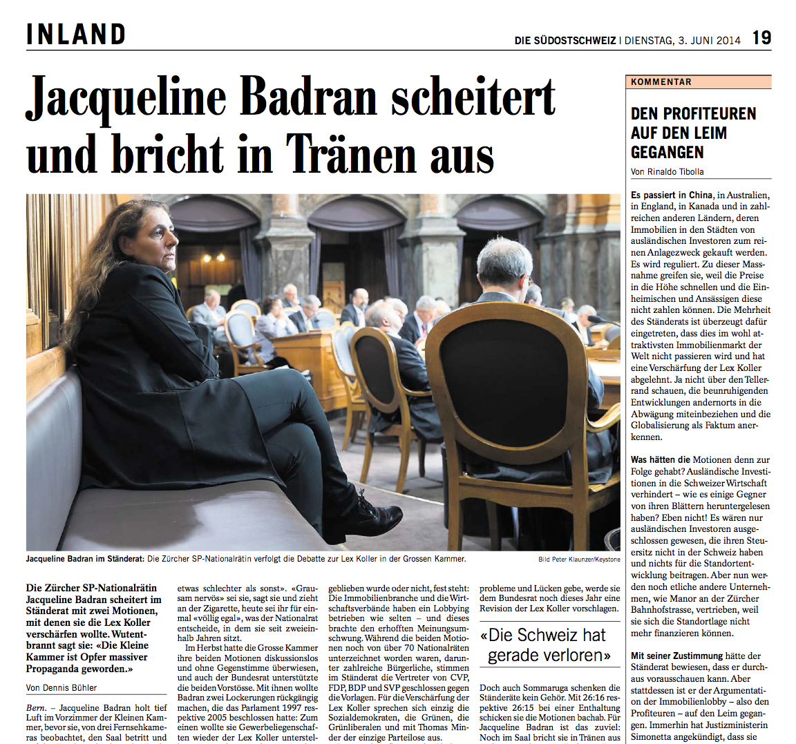 Die Zürcher SP-Nationalrätin Jacqueline Badran scheitert im Ständerat mit zwei Motionen, mit denen sie die Lex Koller verschärfen wollte. Wutentbrannt sagt sie: «Die Kleine Kammer ist Opfer massiver Propaganda geworden.» Ein Sessionsbericht, erschienen am 3. Juni 2014 in der Südostschweiz und der Nordwestschweiz / Aargauer Zeitung.