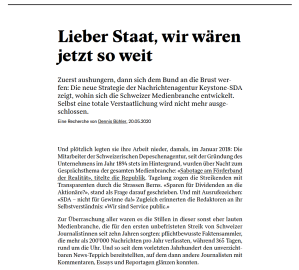 (…) Mitte Mai 2020 verkündete der Verwaltungsrat der Nachrichtenagentur Keystone-SDA via Mediencommuniqué: «Keystone-SDA fokussiert verstärkt auf das Kerngeschäft». Unter anderem wolle man die beiden «volatilen Geschäftsfelder» PR und Corporate Production ausgliedern oder verkaufen. Den Grund dafür kommuniziert die Unternehmensspitze offen: «Mit der Strategieanpassung und den eingeleiteten Massnahmen möchte der Verwaltungsrat das Terrain für eine weitergehende Förderung von Keystone-SDA ebnen.»