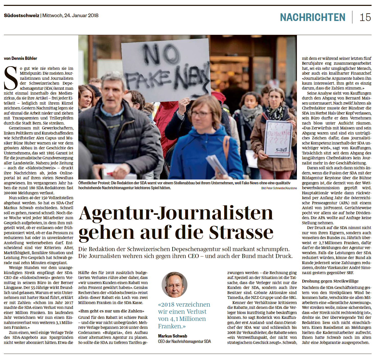 Ein Bericht über die Vorgänge bei der Schweizerischen Depeschenagentur, erschienen am 26. Januar 2018 in der Südostschweiz sowie der Aargauer Zeitung / Nordwestschweiz.