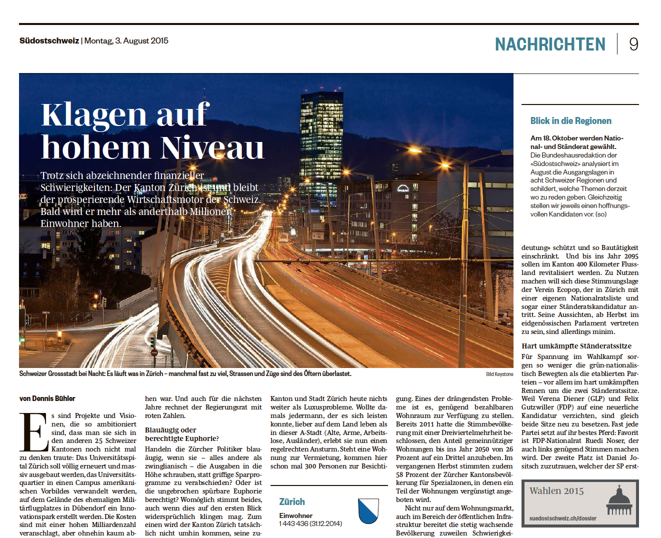 Eine Blick in den Kanton Zürich im Rahmen einer Serie, in welcher wir vor den National- und Ständeratswahlen Probleme und Themen analysieren, die in den verschiedenen Schweizer Regionen bewegen. Erschienen am 3. August 2015 in der Südostschweiz und der Nordwestschweiz / Aargauer Zeitung.