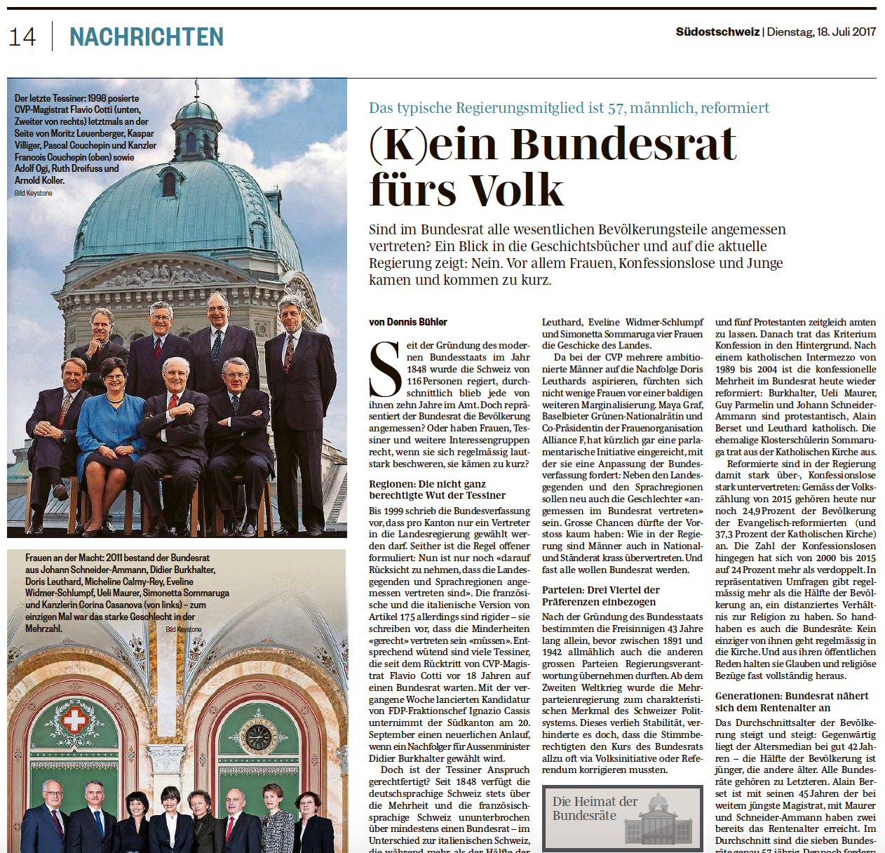 Sind im Bundesrat alle wesentlichen Bevölkerungsteile angemessen vertreten? Ein Blick in die Geschichtsbücher und auf die aktuelle Regierung zeigt: Nein. Vor allem Frauen, Konfessionslose und Junge kamen und kommen zu kurz.